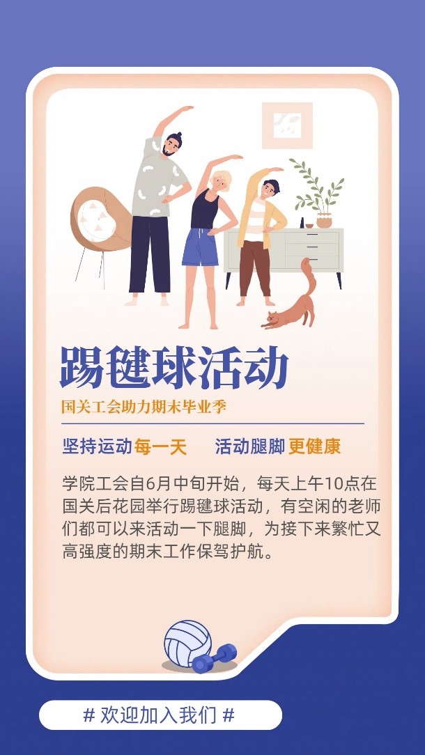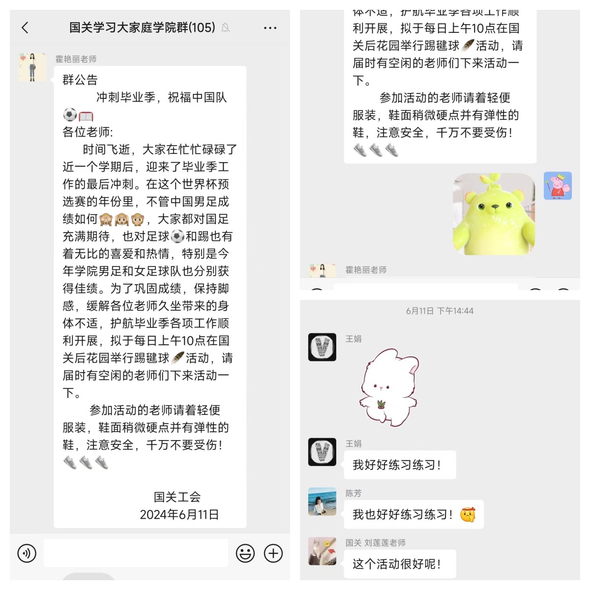 6月11日,国关学院工会在学院教职工微信大家庭,发布了关于举办“冲刺毕业季,祝福中国队——国关工会举办踢毽球活动”的通知,活动由学院工会主席霍艳丽老师首次倡议,一经提议便获得了工会委员的一致认可,并在学院教职工中迅速开展起来。