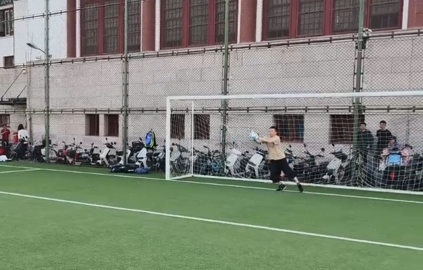 (图2 临危受命的守门员荆宗杰老师扑球)