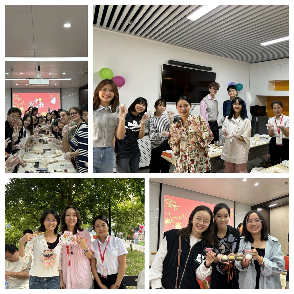 活动现场洋溢着喜庆祥和的节日气氛。学院后花园内灯笼高挂,彩旗飘扬,精心布置的地下大小间展台上,摆放着月饼制作材料、花灯手工材料以及各式传统茶点。活动在欢声笑语中拉开帷幕,师生们热情参与月饼制作环节,揉面、包馅、压模,亲手制作象征团圆的月饼,捏揉出和谐美好的大汤圆,体验传统美食制作的乐趣。花灯制作区域更是热闹非凡,中外学生们巧妙构思,制作出一个个精美别致的灯笼,展现了对美好生活的向往。美食体验之后,猜灯谜环节更是将活动推向高潮,师生们踊跃参与,在趣味互动中增进对中国传统文化的了解。