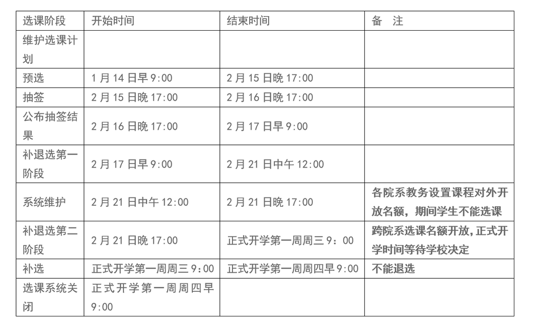 根据教务部最新通知:在发出《延迟开学期间本科教学及相关工作安排Q&A》,不少老师、同学反馈意见,希望选课尽早确定下来。由于学生返校时间至今未定,为避免补退选时间过长,造成教学组织的困难和同学选课状态不定造成的焦虑,教务部经研究,明确了补退选截止时间和选课系统关闭时间,春季学期选课整体仍按2020年元月10日《2019-2020学年第二学期本科生选课通知》的选课时间执行,即: