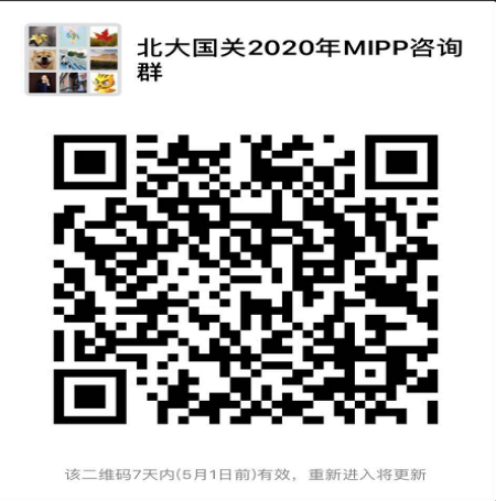 为了让大家更好的了解MIPP,及时解答同学们的问题,我们创建了2021年MIPP项目微信咨询群,需要加入的同学请写上姓名、单位、联系电话、微信号发邮件至MIPP@pku.edu.cn。知乎中的北大MIPP备考小组专栏(https://zhuanlan.zhihu.com/c_1101899735740383232)有刚被录取和正在就读MIPP同学的备考经验介绍,大家可以参考。