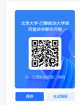 请感兴趣的同学在9月6日上午10点前填写问卷或扫描二维码完成报名,国际项目办会通过邮件告知宣讲会线下具体地点和线上会议链接。https://www.wenjuan.com/s/UZBZJvjCOmH/