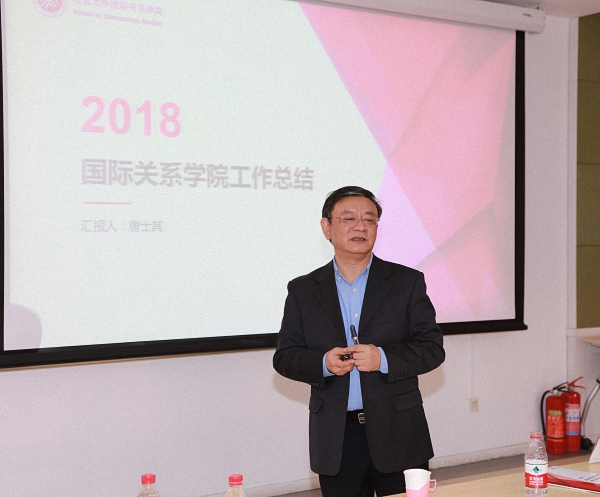 北京大学校长郝平出席会议开幕式并发表讲话。郝平校长在讲话中指出,学校长期关注国际关系学院的发展。学院创办路程艰难,今日成果得来不易,各部门对支持学院发展早有共识。近年来,学校重视人文社科领域建设,希望国际关系学院能够保持学科定力,积极服务国家战略,对接学校政策,充分调动教师积极性,希望国际关系学院在教师队伍建设、人才培养、科学研究等领域再上一个新台阶。王博副校长在发言中表示,国际关系学院已成功完成了新一届领导班子换届,希望学院继续保持发展动力和活力,把握发展机遇和变化,尊重传统,面向未来,积极融入国家、社会和世界大变革中。社会科学学部主任杨河、学科办主任张平文、社会科学部部长龚六堂分别就北大社会科学发展战略、国际关系学院的战略发展与学校学科建设的总体布局关系、学校对科研项目申报的扶持政策、北大未来发展的若干战略思路等情况进行通报。国际关系学院院长唐士其在发言中感谢学校领导和各职能部门对学院工作的大力支持,并对2018年的全院工作进行总结。