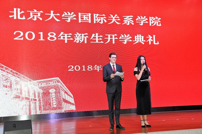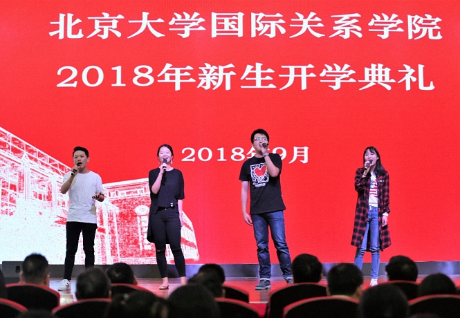2018年9月15日下午2:00,北京大学国际关系学院2018级新生开学典礼在国关楼秋林报告厅举行。院长贾庆国,党委书记虎翼雄,副院长唐士其,副院长范士明,副院长吴强,党委副书记祝诣博,团委书记高静,外交学专业主任张清敏,国际组织与国际公共政策专业主任张海滨,国际政治专业主任初晓波,中外政治制度专业主任汪卫华,科学社会主义与国际共产主义运动专业主任项佐涛,18级本科生班主任陈沐阳、赫佳妮,学工办王雨濛、18级本科生辅导员何凌云和300余名学生共同参加典礼。典礼由18级本科新生马上和硕士新生欧阳海主持。