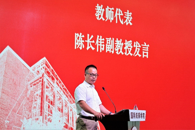 教师代表陈长伟副教授发表了精彩的讲话。陈老师指出,国际关系学科不是预测学,面对纷繁复杂的国际形势,最直接有效的方法就是回溯历史,通过对以往的总结来最大限度解决未来难题。陈老师还将自己的学习经历和感悟分享给大家,并希望同学们在今后的学习与生活中能够发现自己的优点,正确处理好人际关系,与身边同学相互理解、欣赏,保持谦虚的态度和宽容的品格,传承并发扬北大的精神和使命。