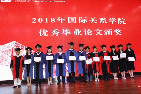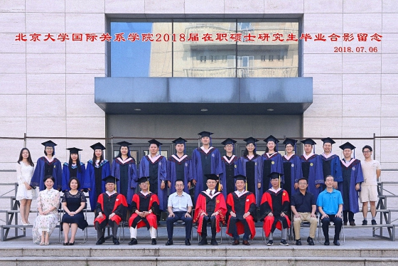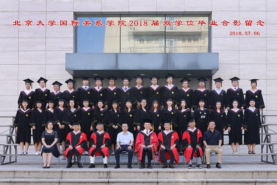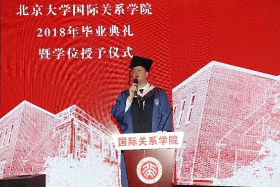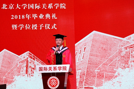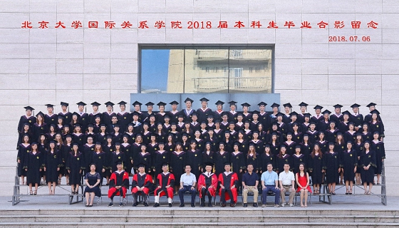 2018年7月6日上午,北京大学国际关系学院2018年毕业典礼暨学位授予仪式在秋林报告厅隆重举行。国际关系学院院长贾庆国,院学术委员会主任叶自成,党委书记虎翼雄,副院长王逸舟、唐士其、吴强,党委副书记范士明、祝诣博,院友代表、院友会副秘书长、《星星散文诗刊》名誉主编周庆荣,各系所负责人、专业主任、班主任,部分毕业生家长和2018届全体毕业生共400余人参加了毕业典礼。典礼由2016级硕士毕业生、来自喀麦隆的留学生门杜和2014级本科毕业生杨子欣共同主持。