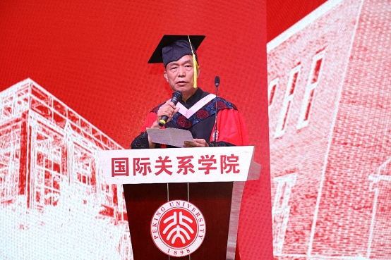 随后,院长贾庆国为毕业生致辞。他对同学们顺利圆满地完成学业、即将走向人生的下一个阶段表示祝贺,勉励同学们在当下诸多诱惑面前无论做人做事都要讲良心、坚守底线。同时,他对毕业生寄予了殷切期盼,希望同学们勿忘国关、勿忘国关人。