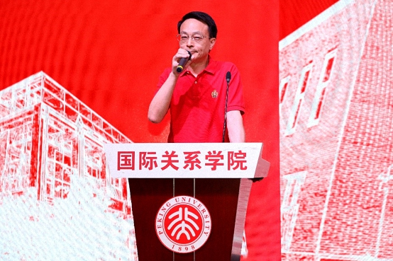 教师代表叶自成教授讲话。他围绕“安心立命”的主题,告诫在坐同学们如何做一名合格的北大国关毕业生,并用亲自题写的一首小诗“四从四德,在我国关”,表达了对同学们的高远希冀,并带领众人诵读所作诗篇,一同领悟国关人应具备的家国情怀。