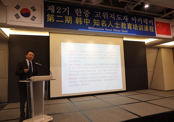 2018年5月30-31日,贾庆国院长应中国驻韩国大使馆邱国洪大使邀请,赴韩国首尔为第二期中韩知名人士教育培训课程授课。讲课于31日上午举行。该系列讲座由中国驻韩国大使馆、韩国21世纪韩中交流协会和韩国国会青年领导者论坛共同举办,此讲是该系列讲座的最后一讲。听课对象包括韩国国会议员、政界元老、媒体高层、企业高管以及社会各界精英,学员以韩国人为主,也有部分在韩中资机构代表。贾庆国院长围绕“中美关系与朝核问题”这一主题向各位与会代表介绍了中美关系面临的主要问题、导致这些问题的原因、中美关系未来的走向以及对朝核问题的影响。