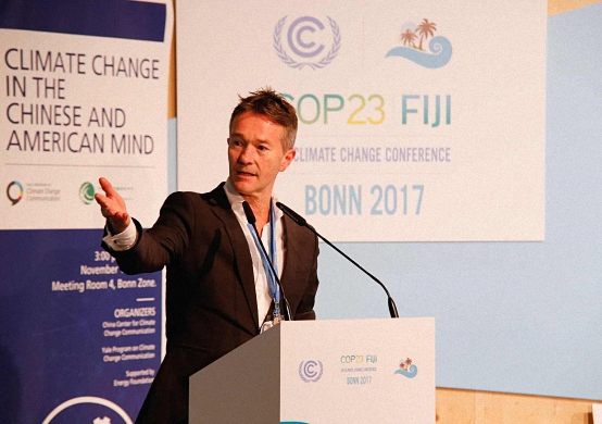 11月10日下午,在中美对比研究专场发布会上,王彬彬博士与耶鲁大学环境与森林学院安东尼·莱斯維茨(Anthony Leiserowitz)教授联合发布基于中美两国公众气候认知最新调研结果的关键数据对比。联合国气候变化框架公约新闻发言人尼克·纳托(Nick Nuttall)先生参加此次发布会,代表公约秘书处执行秘书长帕特里夏·埃斯皮诺萨(Patricia Espinosa)女士致辞充分肯定两国公众调研的积极意义。