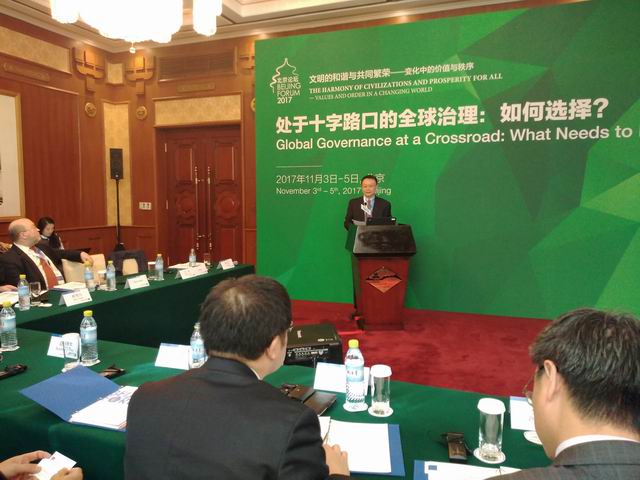 2017年11月5日,第十四届北京论坛(2017)在北京大学圆满闭幕。在过去的两天半时间里,来自世界各地50多个国家和地区的400余位专家、学者相聚一堂,围绕“文明的和谐与共同繁荣——变化中的价值与秩序”主题,共同探讨面对深度调整的全球秩序与国际格局,如何构建起能够应对全新挑战的全球治理体系与人类命运共同体。北大国关学院承办以“处于十字路口的全球治理:世界将怎样选择?”为主题的第三分论坛,由我院贾庆国教授负责学术设计并担任分论坛主席。