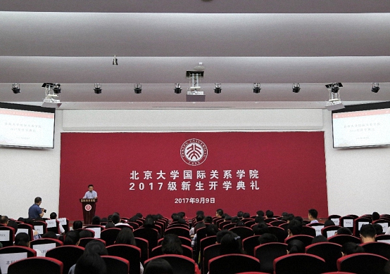 时维九月,序属三秋。2017年9月9日上午,北京大学国际关系学院2017年开学典礼在秋林报告厅隆重举行。国际关系学院院长贾庆国、党委书记虎翼雄、副院长唐士其、党委副书记兼副院长范士明、副院长吴强和张清敏、张海滨、梅然、汪卫华、项佐涛、翟崑、节大磊、雷少华、董昭华、罗杭,17级本科生班主任祁昊天、许亮,辅导员宋昊天、王雨濛共同出席了本次典礼。典礼由学院党委副书记祝诣博主持。