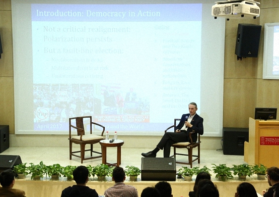 卡赞斯坦教授首先以去年美国大选为引入,介绍了社会极化背景下投票民主越来越难以预测的现实。在卡赞斯坦教授看来,特朗普的当选并不具有必然性,但却是共和党的历史性机遇。紧接着,他又分析了特朗普在美国国内具有的象征性意义,以及对于国际社会的重大影响。