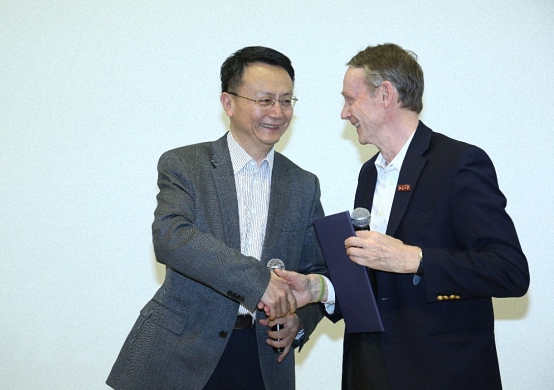在本场讲座结束前,国际关系学院院长贾庆国向卡赞斯坦教授颁发了国际关系学院理事会的聘任证书,在全场的热烈掌声中,讲座圆满结束。