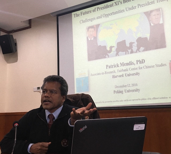 应北大中美人文交流研究基地和北大美国研究中心邀请,哈佛大学肯尼迪学院资深研究员Patrick Mendis12月12日来我院做了题为“特朗普与中国的一带一路战略”的讲座,并与我院师生展开讨论,北京大学国际关系学院副教授、北京大学中美人文交流研究基地执行副主任王栋主持了此次活动。北京大学中东研究中心主任王锁劳教授,北京大学国际关系学院副教授陈绍锋,挪威防务研究所教授Øystein Tunsjø,以及来自我院的研究生、博士生等30余人参加了此次讲座。
