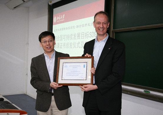 会谈后,Patrick Haverman先生一行参加了联合国开发计划署可持续发展目标网络公开课程证书颁发仪式,向我院通过SDGs网络公开课程测试的十名学生代表颁发了“网络课程合格证书”。Patrick Haverman先生代表联合国开发计划署,向我院授予了“机构推广贡献证书”。