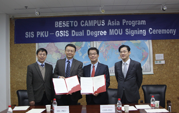 2016年11月3日下午,贾庆国院长、范士明副院长会见了前来参加学院20周年院庆的首尔国立大学国际关系研究院院长朴喆熙教授、亚洲校园项目负责人郑钟昊教授一行四人 。双方高度评价在亚洲项目框架下保持的教学与学术研究合作关系,并期待这种合作能进一步加深加强。随后,双方签署了联合培养双硕士的合作协议。至此, 北京大学国际关系学院、首尔国立大学国际关系研究院以及东京大学公共政策大学院在亚洲校园框架下,形成了完整的双硕士合作项目。东京大学公共政策大学院的那知信惠老师也参加了签约仪式。