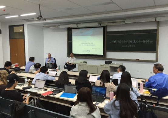 来自国内外的三十名余师生参加了讲座,并就如何评价G20机制、金砖机制与G20之间的关系、G20杭州峰会等问题与巴林大使进行了热烈的交流。丁斗教授、陈绍锋副教授对卡林大使的演讲做了点评。报告会结束时,王勇教授向卡林大使赠送北京大学纪念品,向他表示感谢。他指出,G20在中国举行峰会,是中国参与全球治理,提高中国国际地位的难得机遇。巴林大使在专业之外还出版过有关幽默的著作。幽默可以成为G20沟通的“润滑剂”,如果G20成员特别是G20中美两大国之间在相互沟通上更具幽默感,将改善G20工作的效率,协商也可以取得更大的成果。