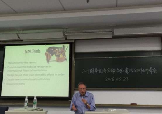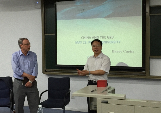 2016年5月23日,北京大学国际政治经济研究中心成功举办《二十国集团与全球治理:兼论中国G20杭州峰会》专题报告会,国际著名智库加拿大国际治理创新中心(CIGI)高级研究员、加拿大前外交贸易部副部长巴里 卡林(Barry Carin)博士主讲。北京大学国际关系学院教授、国际政治经济研究中心主任王勇主持报告会。巴里卡林博士具有丰富的学术与政策实践经验,于美国布朗大学获得经济学博士学位,曾执教于维多利亚大学等校,后出任加拿大外交国际贸易部副部长、驻新加坡大使等职务。近年,巴林大使主要从事二十国集团与全球治理智库交流工作,为二十国集团智库网络(Think 20)主要创办人与协调人。