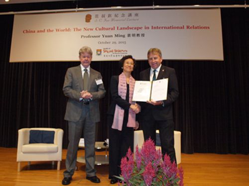 29日晚,袁明教授在香港大学黄丽松讲堂发表了题为“中国与世界:国际关系中的新文化景观”的重要演讲。演讲会开始前,马斐森教授亲自向袁明教授颁授香港大学荣誉教授证书,并致欢迎词,这是港大历史上首次由校长举行公开仪式颁授荣誉教授衔。港大社会科学学院院长卜约翰教授主持了演讲会。马斐森校长及夫人全程参加了袁明教授演讲会。