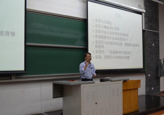 2015年4月24日下午,北京大学国际关系学院研究生会学术部联合北京大学校团委科创部举办以“亚投行(AIIB)与全球经济治理的改革”为题的形势报告会,特邀北京大学国际关系学院教授、国际政治经济研究中心主任王勇博士。校内外300余名师生与相关研究者参加了此次报告会。报告会于北京大学第二教学楼207教室举行。