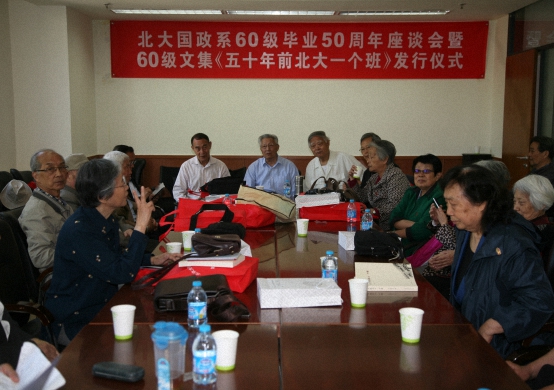 时光如水,岁月如歌。入学五十五周年,莘莘学子在这里播下了希望,放飞梦想。毕业五十周年,则是一部北大60级人在全国各地披荆斩棘、艰苦奋斗的创业史,是一部北大学子自强不息、刻苦成才、铸造辉煌的成长史。2015年5月4日上午,国际关系学院60级22位校友和部分家属,欢聚在国关学院C-105,举行“北大国政系60级毕业五十周年座谈会暨文集《五十年前北大一个班》发行仪式”。院党委书记李寒梅、副院长吴强、原院党委副书记王其芬、60级班主任张映清老师、中国传媒大学出版社责任编辑赵丽华等出席并致辞。