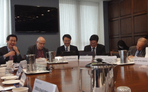 会议第一天以闭门磋商方式进行,由贾庆国院长,韩国高等教育财团事务总长朴仁国大使和美国布鲁金斯学会东亚政策资深研究员Jonathan Pollack教授共同主持,与会者围绕“国际秩序所面临的挑战”、“中韩美三边关系”、“东北亚和平与安全”、“国际经济秩序所面临的挑战和不确定性”等议题展开讨论,贾庆国教授、仇华飞教授,朱锋教授和查道炯教授分别代表中方学者就不同的主题发言,随后与会者就相关议题进行了深入和坦诚的沟通和交流。
