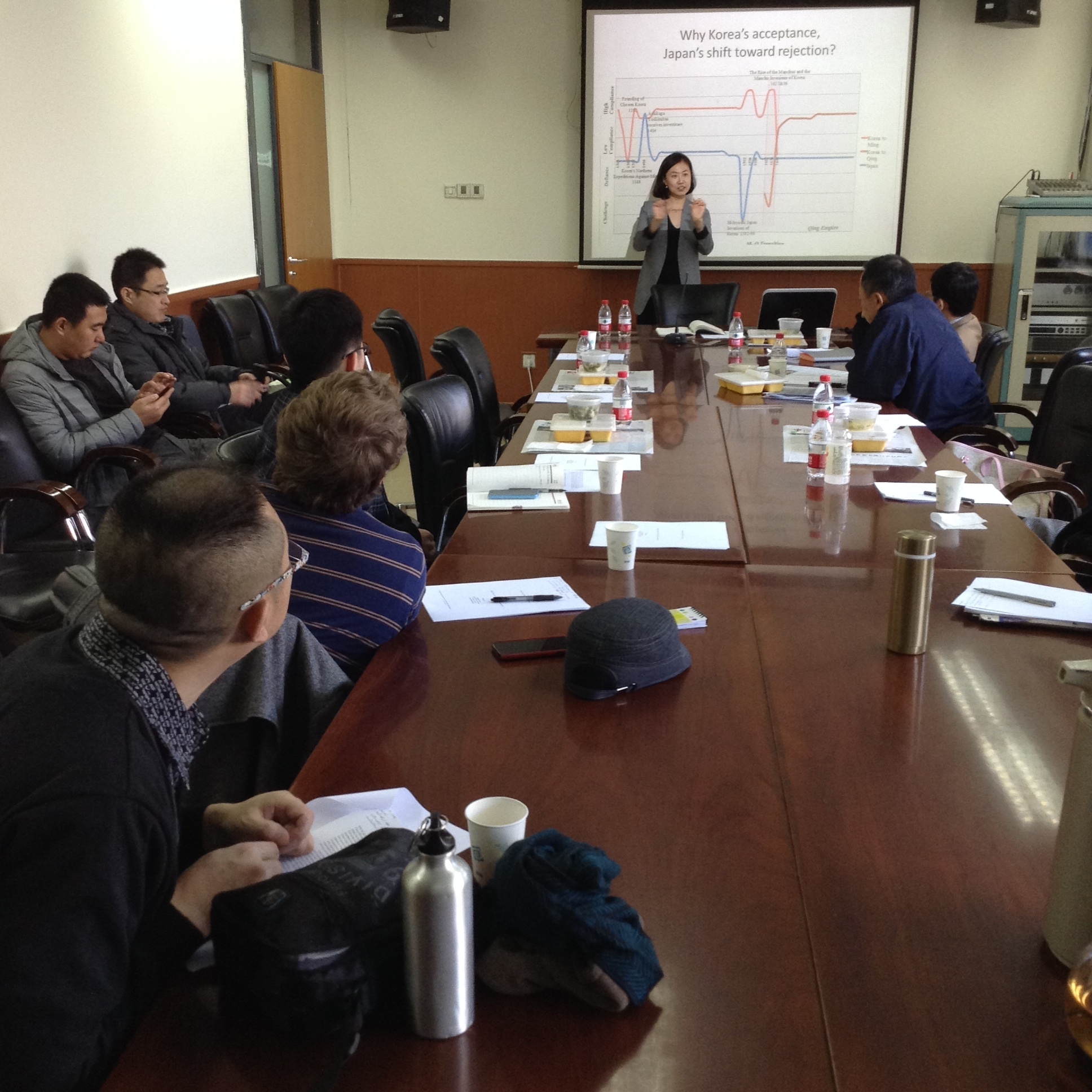 2014年12月19日,美国美利坚大学助理教授Ji-Young Lee博士在我院午餐会上演讲,主题为“从历史看中国在东亚的崛起”,我院归泳涛副教授主持讲座。Lee博士从分析古代以中国为中心的朝贡体系入手,探讨历史经验对理解今天中国崛起的意义。在此基础上,她质疑了目前流行的两种关于中国崛起的观点,一种是中国会借鉴过去的朝贡体系重建地区霸权,另一种是日韩应该寻求安全合作以对抗中国崛起。张植荣教授、项佐涛博士和学院多名硕博、英文项目学生参加座谈。在提问环节,现场师生与Lee博士进行了热烈、充分的互动。