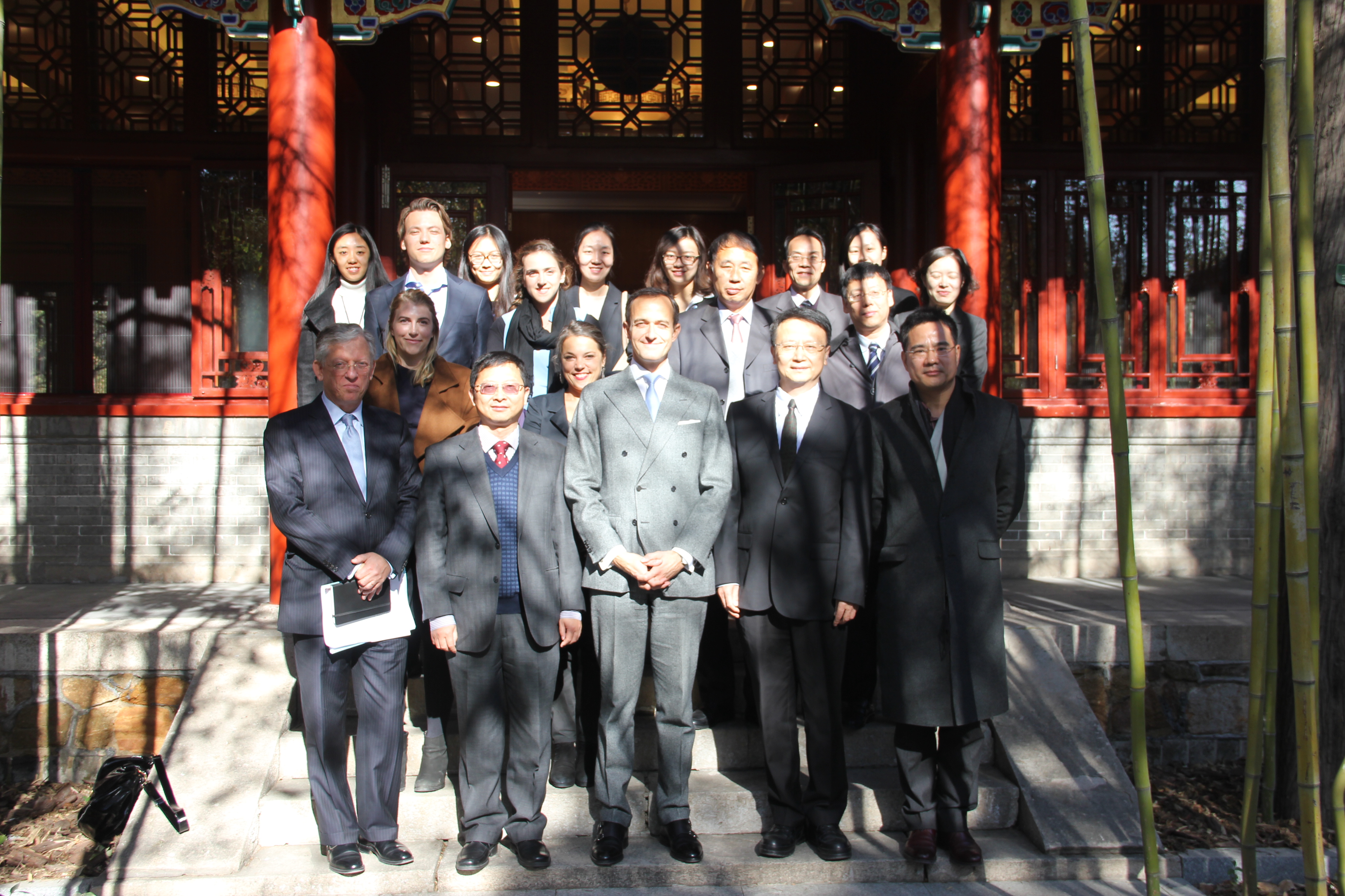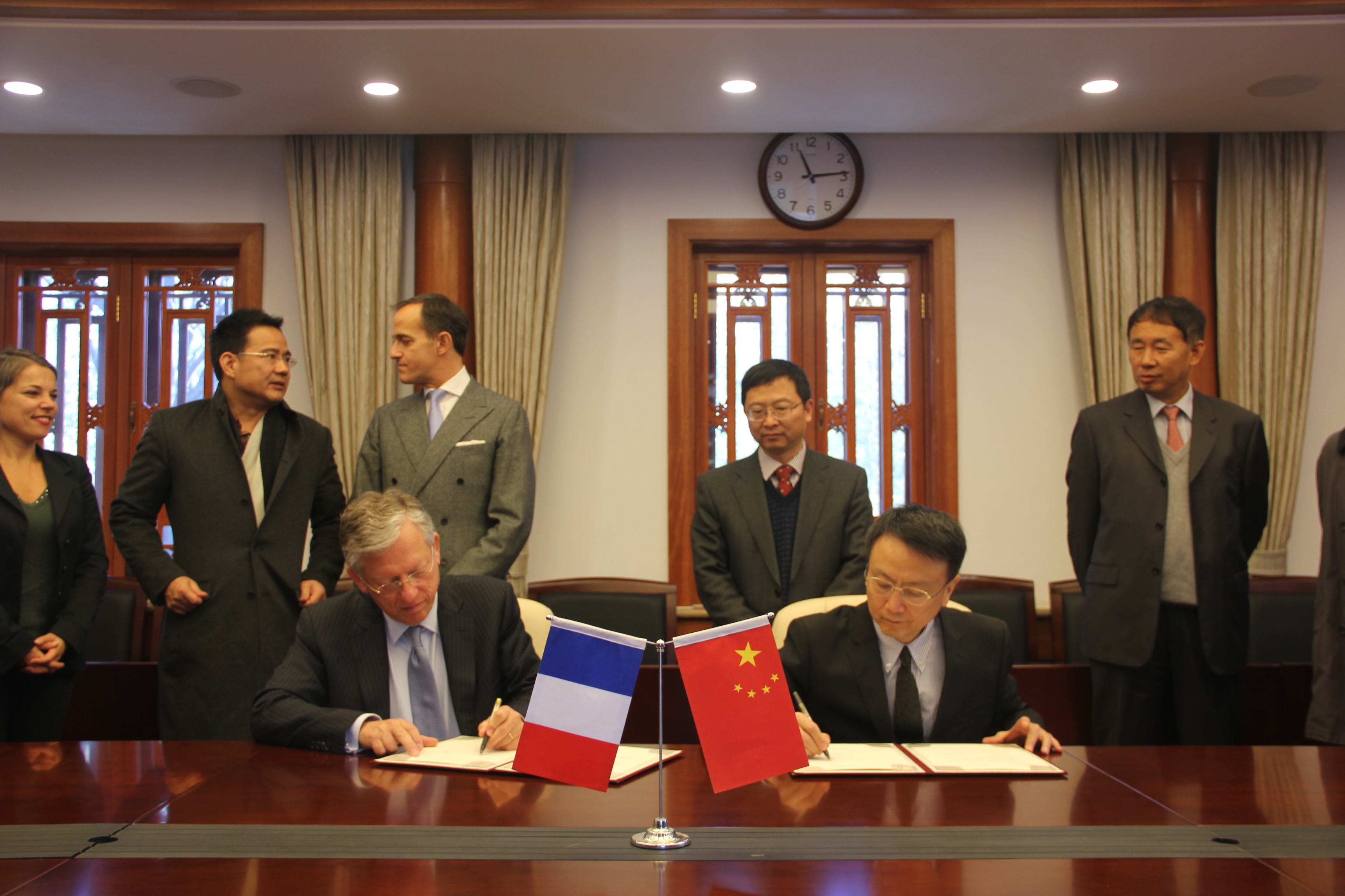 2014年11月17日,巴黎政治大学校长Frédéric Mion先生一行访问北大,高松副校长在临湖轩会见来宾。我院贾庆国院长、范士明副院长、许振洲教授、陈绍锋副教授参加会见。双方分别介绍了两校的基本情况及发展规划和愿景。贾老师、范老师介绍了我院北大-巴政国际关系双硕士学位项目近年来运行的情况,双方一致同意在未来适度扩大招生规模,以促进项目更好地发展。会见结束后,双方续签了北大-巴政项目的框架和工作协议。对方陪同来访的还有:巴黎政治大学副校长兼国际事务与交流部部长Francis Vérillaud先生,国际事务及交流部、亚太非洲及中东地区中心主任Capucine Edou女士,以及巴政中国代表处刘华胤女士和李汀羽女士。北大国际合作部副部长郑如青女士和北大-巴政项目多名在读学生参加会见,并见证签字仪式。