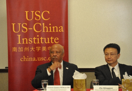 国际关系学院院长贾庆国教授2014年4月21日-27日赴美国洛杉矶、华盛顿和旧金山参加中美双边委员会《通过新一代人、平台和项目建立中美互信》报告英文版正式发布的系列活动。21日下午,发布活动在洛杉矶南加州大学举行,贾庆国院长和南加州大学安娜伯格传媒与新闻学院威尔逊院长向与会者介绍了双边委员会成立的初衷,共同撰写报告的目的,以及对加强中美两国互信的设想和期待,会上还邀请了双边委员会的部分成员和洛杉矶参与组织中美民间交流的代表人士发言,来自洛杉矶地区各界人士大约有100余人参加了该活动。活动前后,两位院长还分别接受了美国记者的采访。