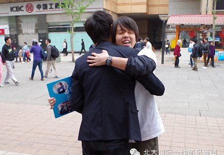 几名来自早稻田大学的日本交换生,拿着“中日友好交流抱抱团”的牌子,向经过的路人们“求拥抱”,吸引了众人围观,也吸引了日本《朝日新闻》、中国日报等媒体的报道。