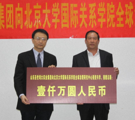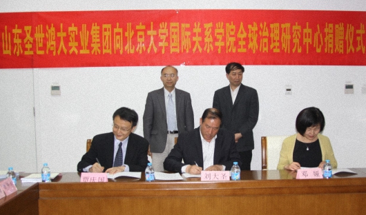 2014年4月14日下午,山东圣世鸿大实业集团向北京大学国际关系学院全球治理研究中心捐赠仪式在北京国际数学中心镜春园82号甲乙丙楼82J13会议室举行。山东圣世鸿大实业集团董事长刘大圣先生、集团办公室主任张宝军先生、同济大学政治与国际关系学院副院长仇华飞教授、北京大学常务副校长吴志攀教授、校长助理、教育基金会秘书长邓娅、国际关系学院院长兼全球治理研究中心主任贾庆国教授,国际关系学院党委书记李寒梅教授、国际关系学院副院长吴强教授、国际关系学院党委副书记祝诣博、国际关系学院学术委员会主任叶自成教授、国际政治经济学系主任王正毅教授、国际关系学院原党委副书记、院友基金会办公室主任王其芬等师生代表出席捐赠仪式。仪式由国际关系学院党委书记李寒梅教授主持。