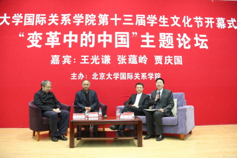 开幕式结束后,“变革中的中国”主题论坛正式开始。王光谦、张蕴岭和贾庆国三位嘉宾分别从不同的视角对“变革中的中国”这一命题阐述了自己的见解。王光谦院士结合自身经历以“变革中的中国教育”为主题发言,通过对比海内外高校教学方式,提出了大学创新式发展的思路,并对教育公平进行了深入的探讨。张蕴岭教授就如何“应对变化的外部环境”展开详细论述,分析了半个多世纪以来中国在国际舞台上的角色定位的变化,并深刻地指出,在中国综合国力进一步提升、国际地位进一步提高的当代,应该进一步实现由“求生存”到“求发展”的转变这一目标。他强调,我们不应该走传统的大国模式道路,而是要更加努力建立和加强与周边国家的伙伴关系,创造睦邻友好的周边外交局面。贾庆国教授作为今年“两会”的政协委员,与大家分享了两会的新变化:一是提案数量大大增加,二是代表结构有较大变动。他认为,这两点都反映出我国在民主政治的建设过程中又向前迈进了一大步。他指出,在当下的“大变革”中,政府更加需要简政放权,这也是我国改革的大势所趋。最后,宋伟老师主持了提问环节,三位嘉宾与来自各个学校和院系的参与者就克里米亚问题、朝鲜半岛核问题和传统文化教育问题等进行了热烈的讨论,在思想的交锋中全场气氛达到了高潮。
