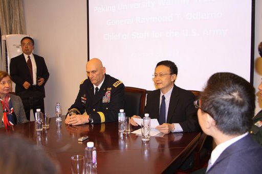 2014年2月21日下午,我院贾庆国院长陪同王恩哥校长在临湖轩一同会见了来访的美国陆军参谋长雷蒙德·奥迪尔诺(Raymond Odierno)上将一行。王恩哥校长对奥迪尔诺上将的来访表示热烈欢迎,并向其简要介绍了北京大学与美国高校的交流情况。