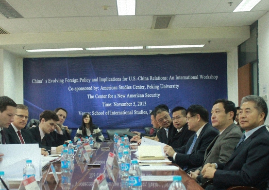 2013年11月5日上午8:30至12点,由北京大学美国研究中心与美国著名智库新美国安全中心(Center for a New American Security)联合举办的“中国外交政策的演变与中美关系”国际研讨会在北京大学国际关系学院C105举行。来自北京大学、中国国际问题研究所、国防大学、军事科学院以及美国、瑞典、丹麦的近20位学者参加了这一学术研讨会。北大国际关系学院院长王缉思教授和新美国安全中心资深主任Patrick Cronin博士首先为研讨会致辞。王缉思教授认为国内政治和国际环境共同推动着中国外交政策的演变;Cronin博士则认为现在的中国外交政策变化吸引着国际社会的广泛关注,在此背景下,中美关系的发展与外交政策的研究尤为重要。随后,会议围绕目前中国外交政策的变化及其对中美关系的影响等问题进行了深入交流与探讨。