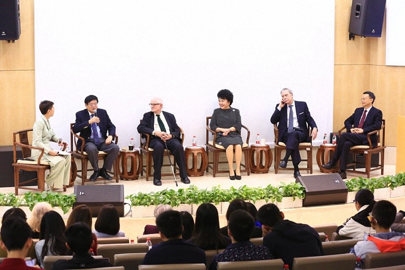 在高端对话环节,裘援平、北京大学国际战略研究院院长王缉思教授、贾庆国同古铁雷斯、卜励德围绕中美关系相关问题展开深入交流。央视著名主持人田薇主持了主旨演讲和高端对话环节。
