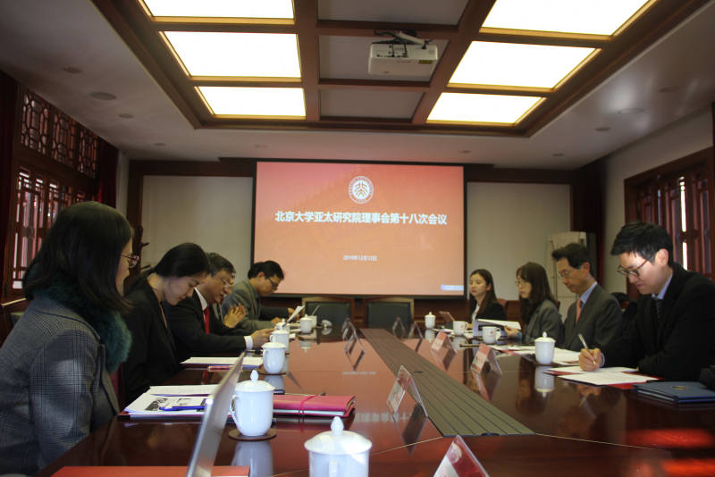 2019年12月12日,北京大学亚太研究院理事会第十八次会议在北京大学临湖轩东厅举行。北京大学校长郝平、国际关系学院院长唐士其,国际合作部部长夏红卫、副部长郑如青,教育基金会秘书长李宇宁,亚太研究院院长李寒梅、副院长吴杰伟等出席并会见了崔钟贤学术院院长兼韩国高等教育财团事务总长朴仁国一行。