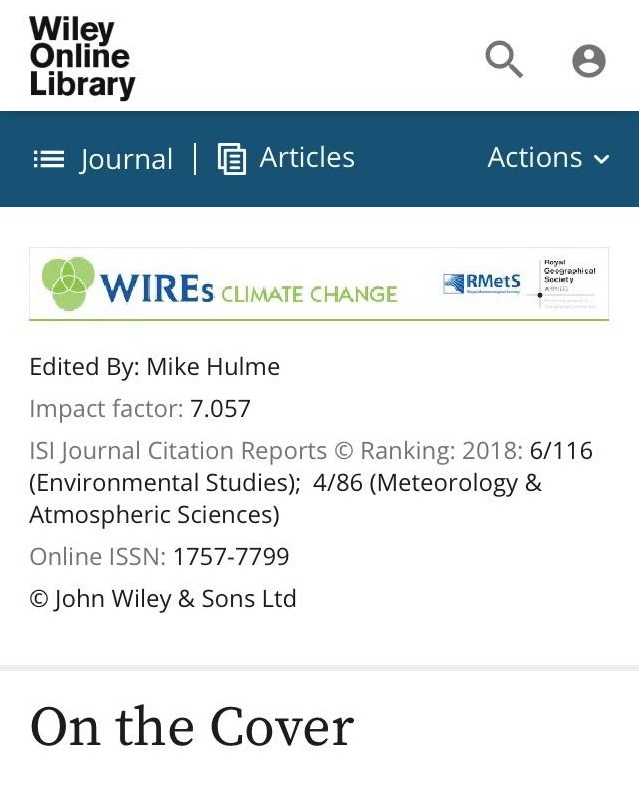 WIREs Climate Change是SCI/SSCI双收录期刊,是环境/大气领域的国际旗舰杂志,仅发表受编辑邀请的文章,有严格的匿名评审程序。2018-2019年影响因子7.057,在气象/大气科学领域世界排名第4,在环境研究领域世界排名第6。