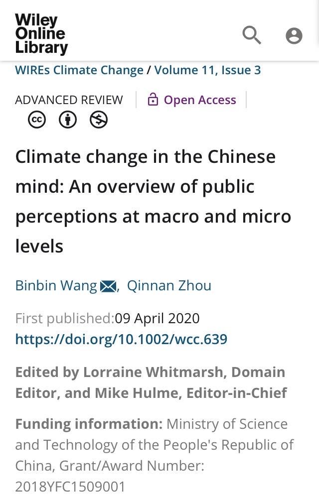 文章引用链接: Wang B, Zhou Q. Climate change in the Chinese mind: An overview of public perceptions at macro and micro levels. WIREs Clim Change. 2020;11:e639.