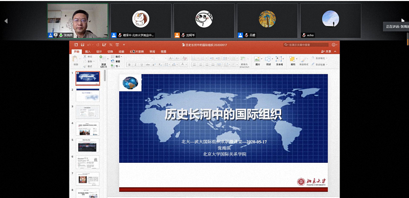2020年5月17日下午,北京大学学生就业指导服务中心和武汉大学学生就业指导服务中心联合举办“国际组织求职微课堂”系列活动首场专家报告,邀请北京大学国际关系学院副院长、国际组织与国际公共政策系系主任张海滨教授,为来自北京大学、武汉大学的两百余名学子带来主题为“国际组织的历史、现状与改革”的报告。本次报告由北京大学学生就业指导服务中心副主任吕媛主持。