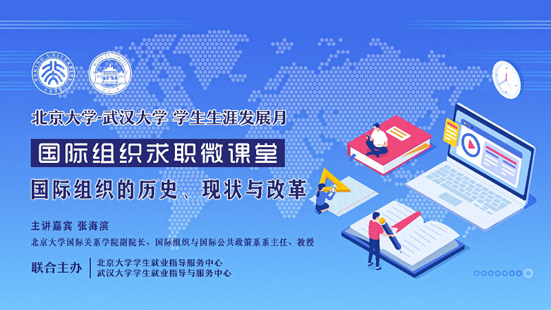 2020年4月,教育部启动实施全国高校与湖北高校毕业生就业创业工作“一帮一”行动,按照上级部署,北京大学与武汉大学结对。根据目前两校毕业生就业特点和需求,4月底至5月底,两校共同开展以“共战疫情、携手就业”为主题的学生生涯发展月,分为云双选、云宣讲、云课程、云培训、云沙龙、云咨询、云画展七个“云”板块。作为云培训板块的品牌项目,北京大学-武汉大学国际组织求职微课堂于2020年5月启动,计划通过专家报告、专题讲座和生涯沙龙等形式,讲述国际组织职业发展与动态前沿,助力两校学子圆梦国际舞台。