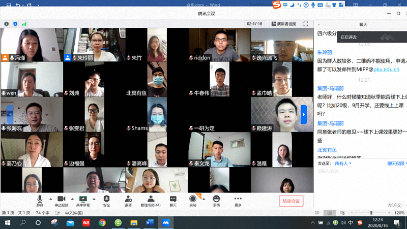 2020年8月16日上午,北京大学国际关系学院国际公共政策硕士项目(MIPP)在线招生说明会在腾讯视频会议平台举行。国际关系学院副院长、国际组织与国际公共政策系系主任张海滨教授、研究生办公室魏西凝老师、MIPP项目前任班主任朱玲丽老师、学院科研秘书兼MIPP班主任冯瑾老师以及三位MIPP项目优秀学生代表参加说明会。说明会吸引了来自中央国家机关、高校、大中型企业、媒体等各个行业的80余位在职人员参与,冯瑾主持说明会。
