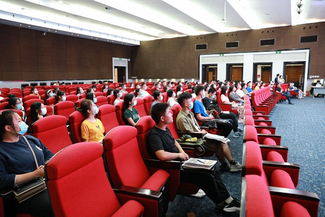 9月1日当晚,国关新生们齐聚新鸿基楼秋林报告厅,为配合疫情防控相关要求,同学们全部佩戴口罩,隔位就坐。