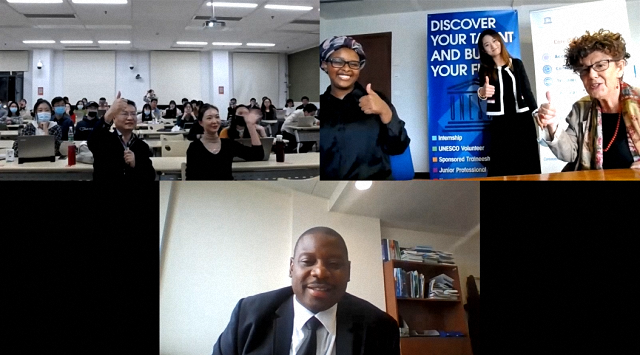 Rossella Salvia女士和Ngome Jean-Paul博士首先向同学们介绍了联合国教科文组织的工作理念、机构设置、全球布局、发展目标、具体功能、人才需求等内容,使得同学们对UNESCO有了更全面的认识。随后,他们进一步分享了在工作岗位上的心得与体会,并鼓励同学们培养国际化视野与情怀,将来投身国际组织事业。在问答环节中,Salvia女士及其团队就新冠疫情期间教育模式的发展、UNESCO在普及科学知识工作中的作用、UNESCO如何促进机构的多元化等问题上与同学们进行了深度交流互动,达到了预期目的。最后,张海滨教授对宣讲活动做了总结,并向联合国教科文组织表示感谢。