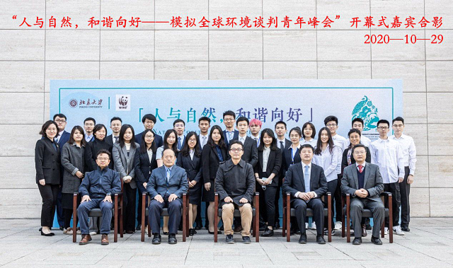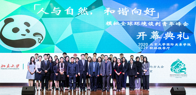 在中国紧锣密鼓积极筹备《生物多样性公约》第十五次缔约方大会和习近平主席于2020年9月30日在联合国生物多样性峰会上发出“坚持多边主义,凝聚全球环境治理合力”的重要倡议之际,10月29日上午,由北京大学国际关系学院与世界自然基金会(瑞士)北京代表处共同主办,北京大学国际关系学院国际青年发展研究中心协办的“人与自然,和谐向好——模拟全球环境谈判青年峰会”在北京大学秋林报告厅隆重举行。《生物多样性公约》执行秘书伊丽莎白•穆雷玛、生态环境部宣传教育中心主任贾峰、国家发展和改革委员会国际合作司副司长高健、中国联合国协会副会长兼总干事张丹女士、北京大学国际关系学院副院长、国际组织与国际公共政策系系主任张海滨教授、世界自然基金会(瑞士)北京代表处生物多样性公约倡导项目主任李楠等嘉宾出席开幕式并致辞。全国70多所高校的350余名大学生代表通过线上与线下相结合的方式参加开幕式。开幕式举行前,北京大学国际关系学院党委书记初晓波教授会见了参会嘉宾。开幕式由北京大学国际关系学院党委副书记祝诣博主持。