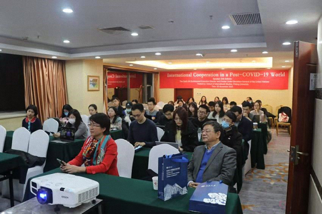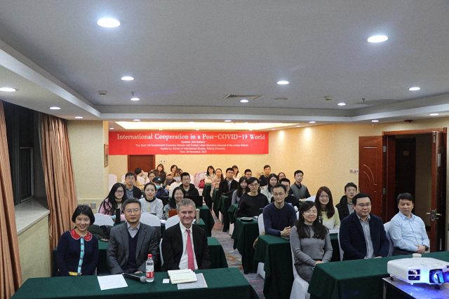 2020年11月26日,联合国原副秘书长、联合国环境规划署原执行主任,挪威原环境与外援大臣,第六届中国环境与发展国际合作委员会副主席埃里克·索尔海姆先生(Mr. Erik Solheim)和世界资源研究所北京代表处首席代表方莉女士一行应邀访问北京大学国际关系学院并发表“新冠疫情后的国际合作”特别演讲。演讲采用线上线下结合的方式进行。北京大学国际关系学院院长唐士其,副院长兼国际组织与国际公共政策系系主任张海滨,国际组织与国际公共政策系副主任雷少华、助理教授刘莲莲、罗杭、赖华夏等教师和50多名学生出席线下会议。