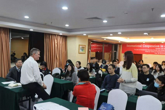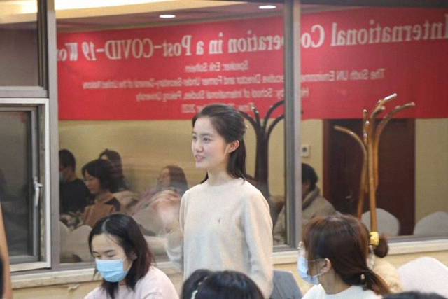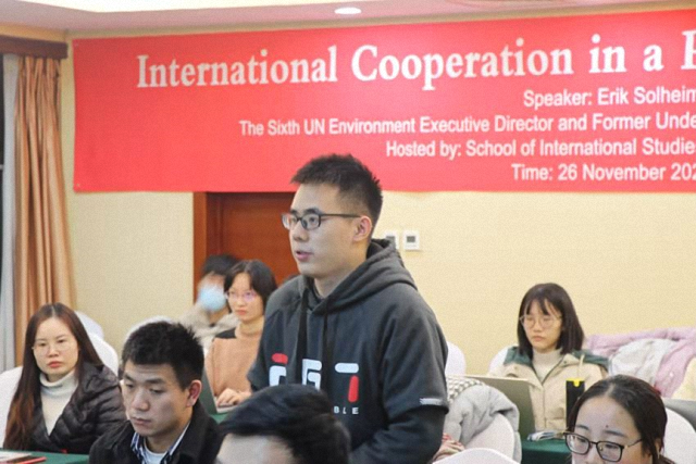 演讲结束后,同学们围绕在气候变化问题上如何避免搭便车现象;“新冷战”背景下诸多领域的国际合作还能否持续;中国如何平衡“发展中国家”和“负责任大国”两种身份之间的关系;中美欧未来在环境治理中的领导权转移;成为国际公务员所需要的优秀品质等诸多问题踊跃提问,埃里克·索尔海姆先生针对现场及线上学生提出的上述问题发表了独到见解,现场气氛十分热烈。