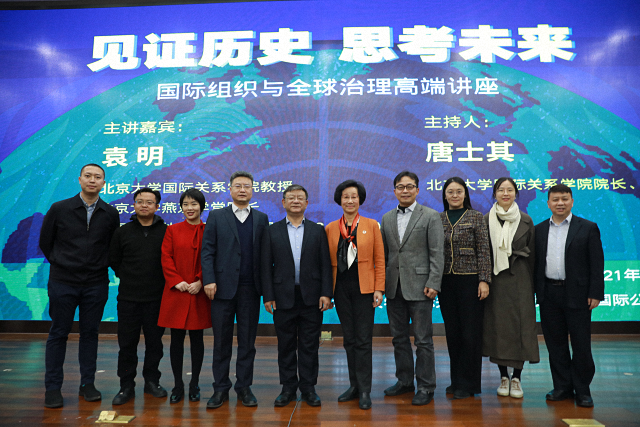 2021年3月20日下午,国际组织与全球治理高端讲座“见证历史,思考未来”在北京大学国际关系学院秋林报告厅成功举办。本次讲座由北京大学国际关系学院教授、北京大学燕京学堂院长袁明主讲,北京大学国际关系学院院长、教授唐士其主持。国际关系学院党委书记初晓波,副院长张海滨、董昭华,党委副书记祝诣博,北京大学燕京学堂副院长范士明和雷少华、罗杭、陈沐阳、赖华夏等教师及二百余名北大学生齐聚现场,另有一百余名观众通过线上直播的形式聆听了讲座。