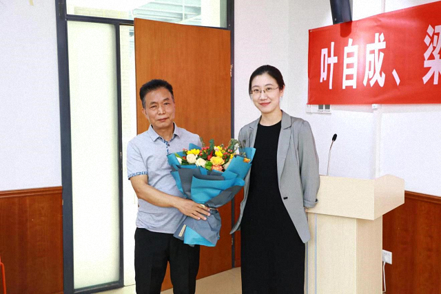 (青年教师代表赫佳妮给叶自成老师献花)