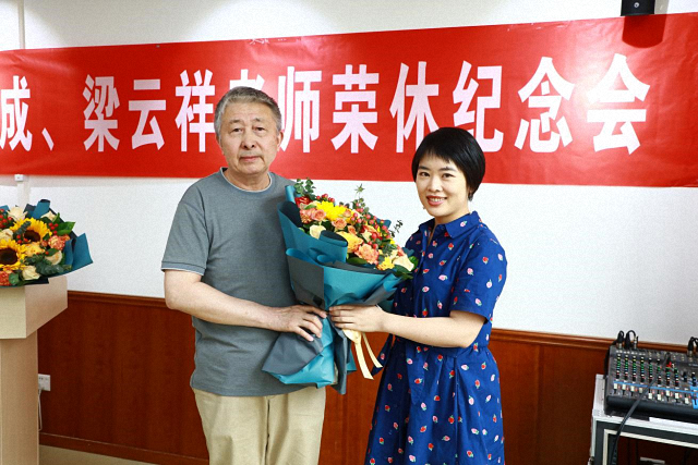 (青年教师代表赖华夏给梁云祥老师献花)